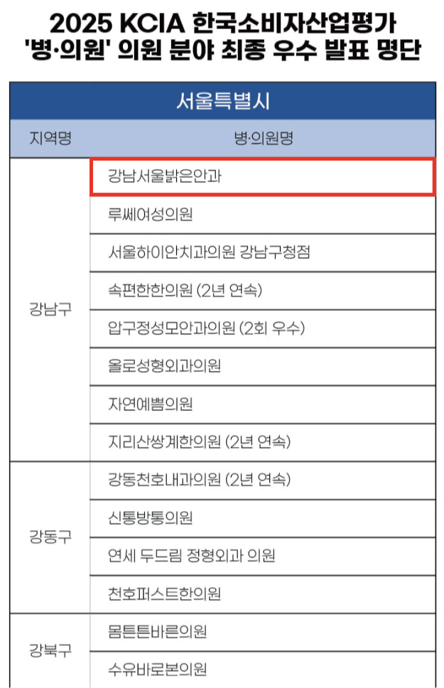 강남서울밝은안과, KCIA 한국소비자산업평가 우수 의원 선정