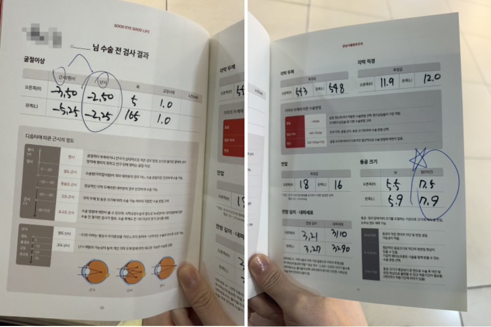 상담해주시는 분과 수술일정을 잡았습니다. 눈 검사지도 책자에 적어서 주심